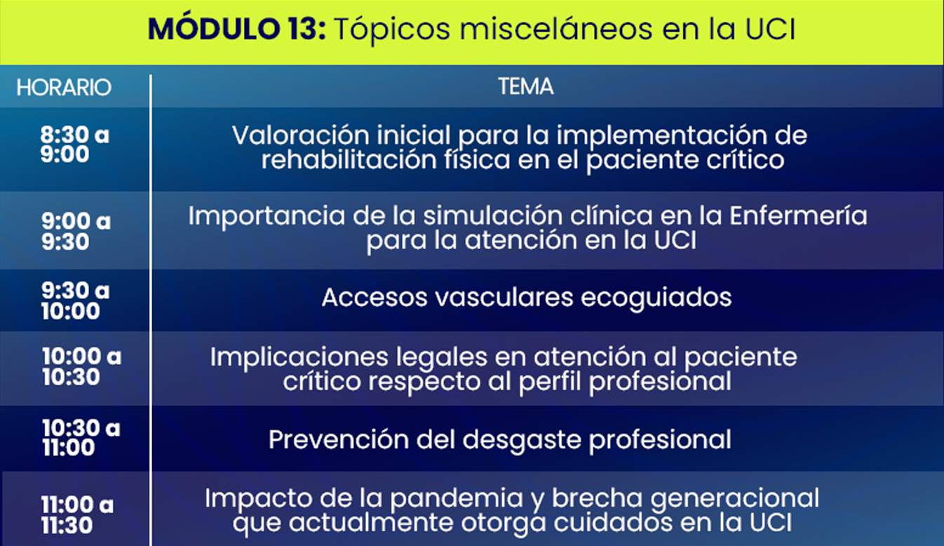 Este evento de alta especialidad en enfermería crítica y terapia intensiva reunirá a expertos nacionales e internacionales para compartir conocimientos, avances científicos y estrategias innovadoras en el cuidado del paciente en estado crítico.